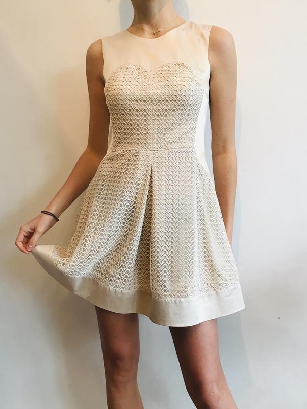 Дуже гарне плаття ніжного кремового кольору з комбінованої тканини{ атлас і щільне мереживо } . Силует від талії кльош. Розмір м
