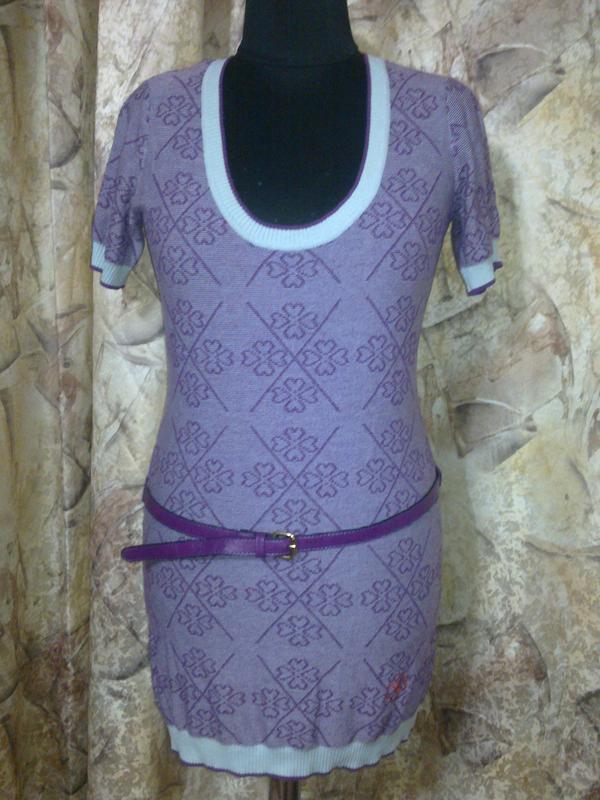Классное, стильное платье, светло-серо-голубого цвета, в сиренево-лиловые полосочки и узоры, имеет приталенный, мини-фасон. Вырез округленный с трикотажной отделкой, рукава короткие, также с отделкой и такая же отделка идет по низу, изделия. Под поясок, на заниженной талии, слева, по низу, спереди есть вышивка красной нитью, логотипа фирмы. Изготовлено брендовой, немецкой фирмой ONLY, из вискозы и акрила, приятная, мягкая, вязанная трикотажная ткань, хорошо тянется.В комплекте есть поясок. Размер 52-54, XL. Состояние отличное. РАЗМЕРЫ: ПОГ.=50см, ПОТ.=43см, ПОБ.=55см, Длн.издл.=88см, Длн.рукв.=24см, Шир.плеч=41.5см. ЛОТЫ КОМБИНИРУЮ!!!
