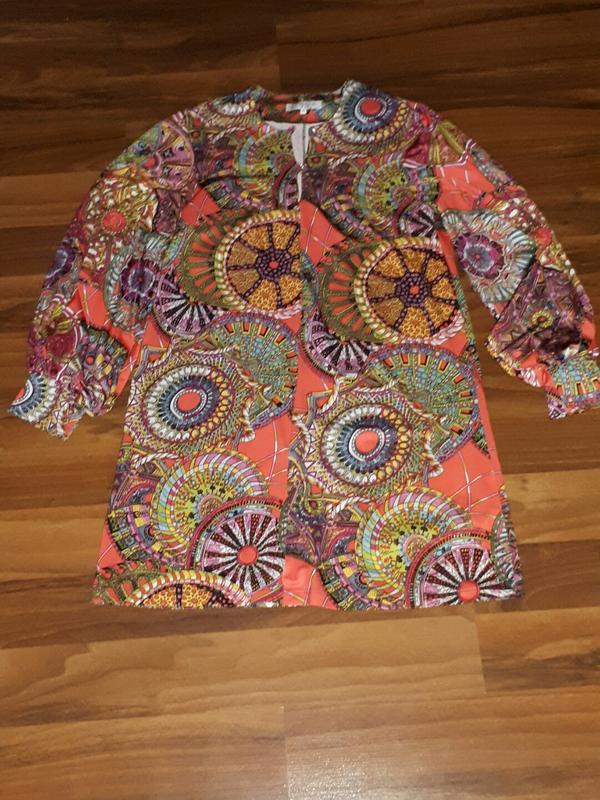 Платье в красивой яркой расцветке, свободного кроя, трапецией, в идеале. Длина по боковому шву 64 см, длина по спинке 88 см. Пересылаю.