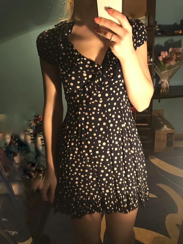 Коротенька сукенка, в горошок, по зоні декольте ідуть легенькі акуратні рюшики 🙂 Стан дуже хороший, дефектів немає, розмір С.
