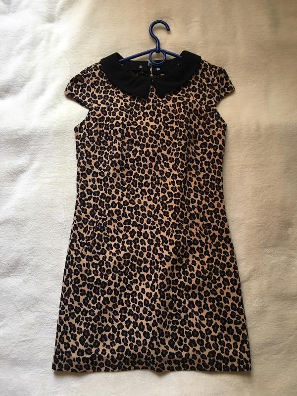 Короткое леопардовое платье, воротник отстегивается, есть подкладка и карманы. Есть небольшой дефект - сзади снизу ткань шероховатая из-за утюга, участок такой ткани небольшой, приложила фото. Замеры: Длина - 78 По спине - 42 (от подмышки до подмышки) Плечи - 34
