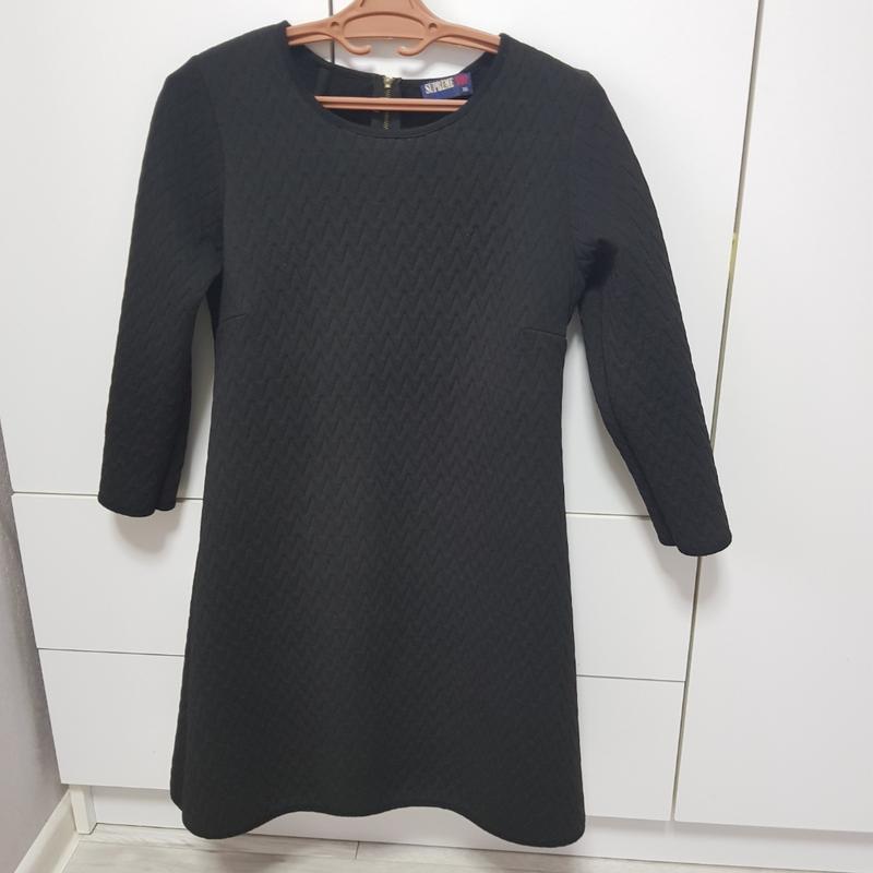 миле платтячко чорного кольору з цікавою структурою. дуже гарно лягає по фігурі. до низу трохи розширене. четрертний рукавчик. не сток.