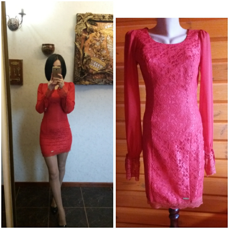 Шикарное красное платье!перед из дорогого кружева,рукав-шифон,манжеты с кружева.Зад платья -атлас.Очень эффектное платье! Д 85см Р 56 с манжетом 56(переход с шифона на гипюр имеется резинка на рукаве) ОГ 37см