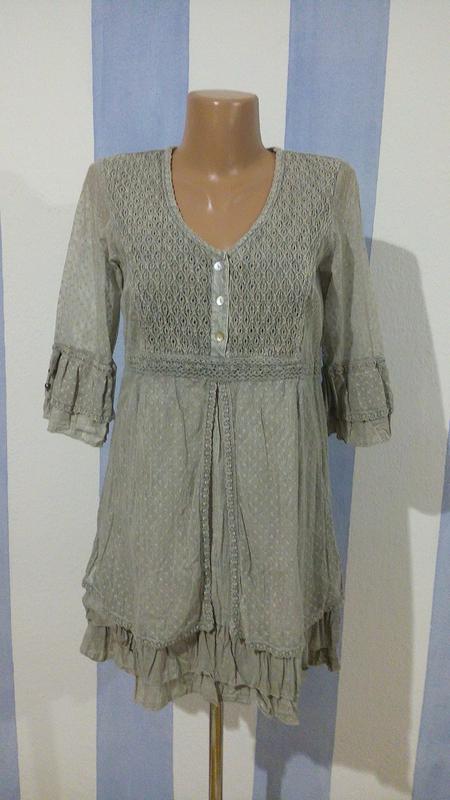 Сукня хб,бірки зі складом тканини зрізані,але і так видно.Сукня зовсім нова,ефект варки. Розмір вказано Л, 40, підійде і на М. Плечі- 39 Пог- 50 Пот- 44-45 Поб-58 Рукав- 3/4 - 41 Довжина- 81-83 Збоку замочок,під мереживом підкладка з цієї ж тканини.