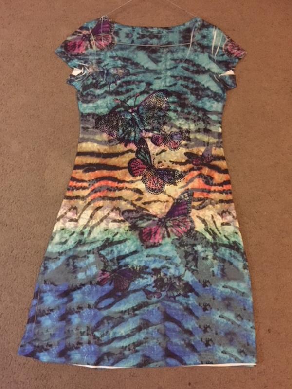 Удобное и приятное к телу платьеце. Ткань похожа на "микромасло." Размер М. Штампованый рисунок с пробелами на складочках это фишка (фото 5).Длинна -92см,ПОГ-42см. ПОТ-37см ПОБ-45см