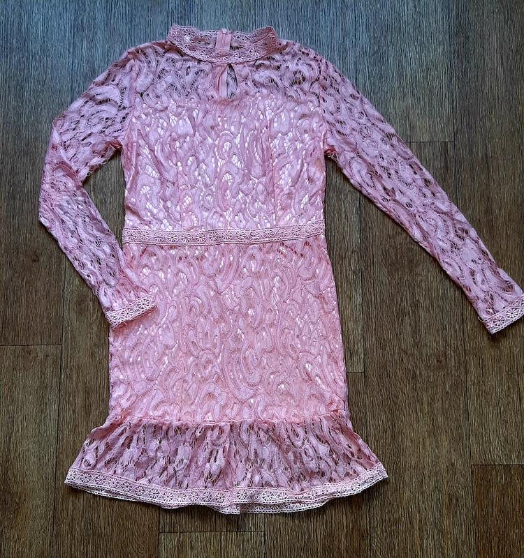 Очень красивое платье из кружево на подкладке(трикотаж).На спине замок По краю рукавов и низ декорировано кружевом.На размер С.Цвет нежно -розовый.