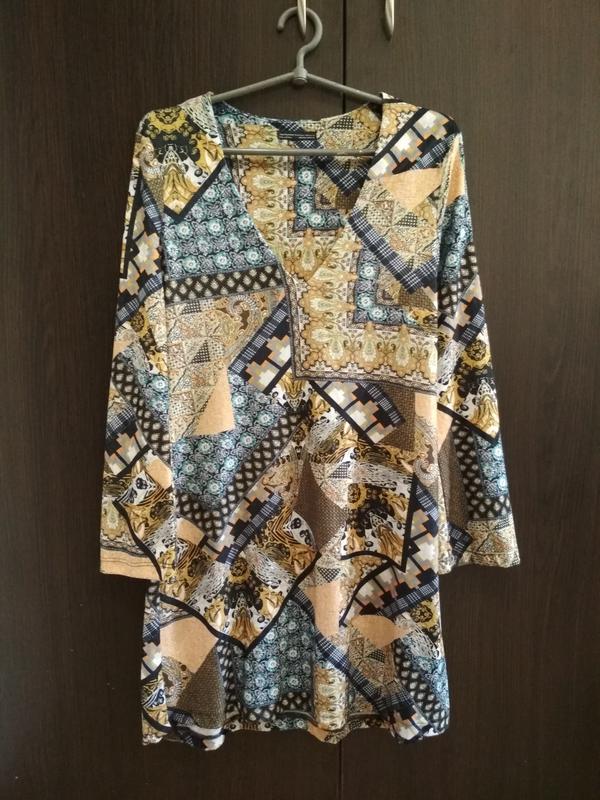 Осеннее платье, как новое, надевалось пару раз. Размер М. Модная расцветка печворк. С глубоким вырезом, чуть расклешонными рукавами. Длина от верхней точки 85см.