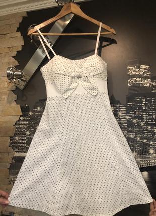 Красивое милое котоновое платье белого цвета в черный горошек,с чашечками,на брительках,которые регулируются,производства Италии,размер М.Красиво лежит.
