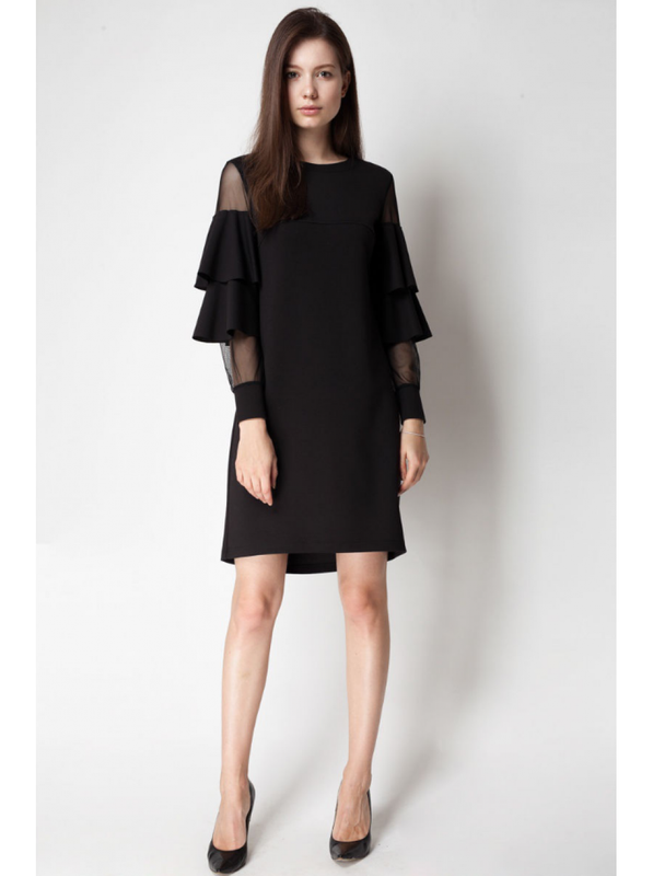 Оптовая цена действует до нового года Платье с сеточкой на рукавах и пышными рюшами в черном и в темносинем цвете. Ткань: креп-дайвинг Размер Обьем груди Обьем талии Обьем бедер Стандарт Украинский см. см. см. XS 42 82-85 66-69 89-92 S 44 86-89 70-73 93-96 M 46 90-93 74-77 97-100 L 48 94-97 78-81 101-104 XL 50 98-102 82-85 105-108
