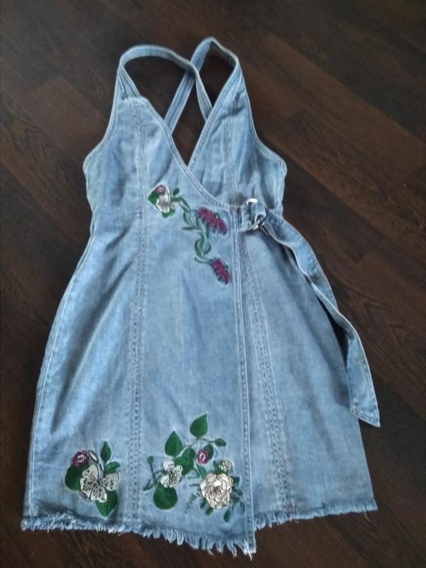 Джинсовый сарафан на запах Шлейки сзади крест - накрест С красивой вышивкой Д-84 см Ширина от подмышки к подмышки - 36 см Талия 33см Бёдра 42см