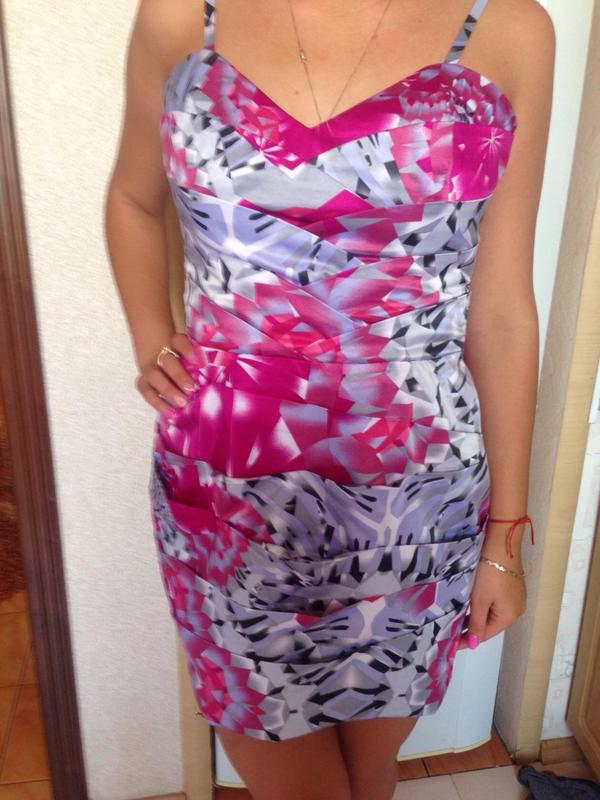 Нарядное атласное платье-бюстье сдрапировкой.Размер указан 14,Но пойдёт на 12 Обхват груди=88-89см От-78см ОБ-100см Длина-80см(с бретельками,их высота регулируется)
