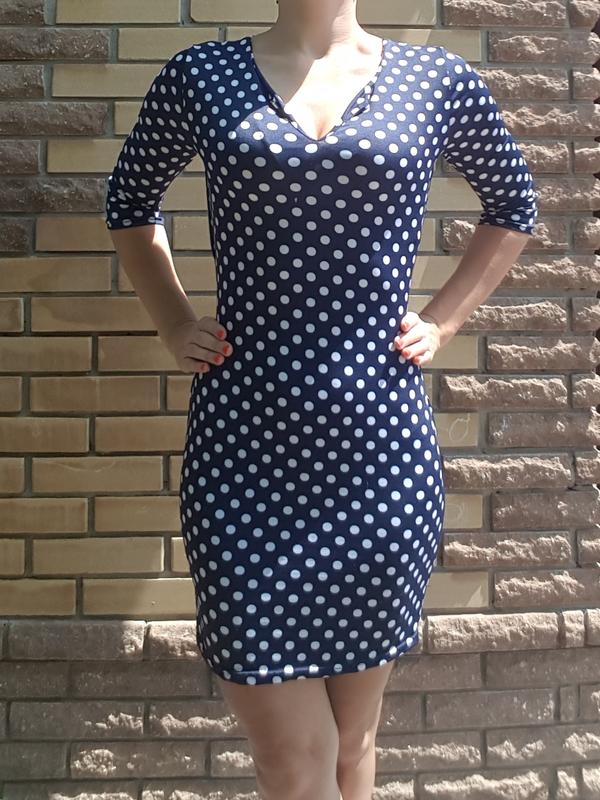 Платье темно-синего цвета в беленький мелкий горошек, размер s-m, очень хорошо тянется. Состояние идеальное, надето несколько раз, так как великовато Талию ушивала на 63см, можно увеличить сантиметров на 8-10. Длина 78см