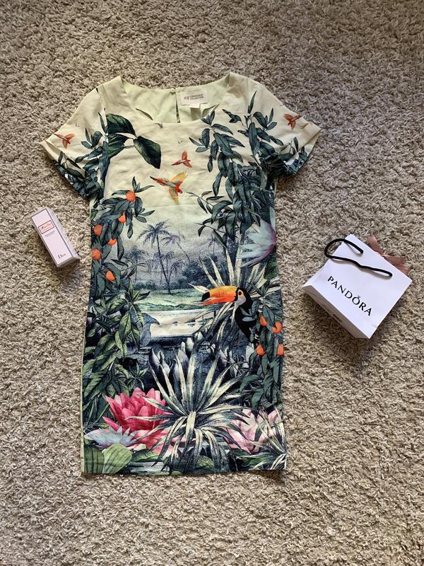 Очень нежное и красивое платье от h&m. Очень лёгкое. Красивый и оригинальный принт. Из нюансов крошечная зацепка на клюве у пеликана.