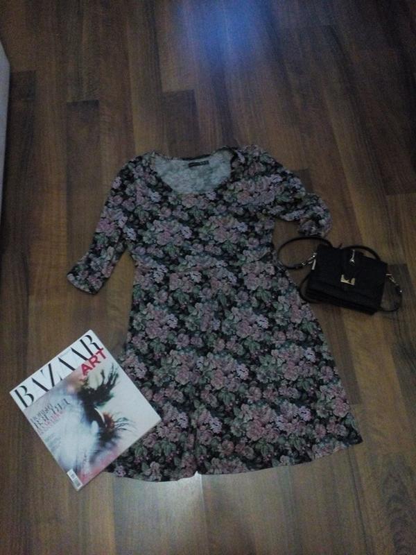 Приятное цветастое платье (на темном фоне розовые цветы и зеленые листочки) заставит оглядываться Вам в след. Нежное, женственное, короткое платье намекает на игривость и флирт. Платье приятное на ощупь. Длина 85 см.