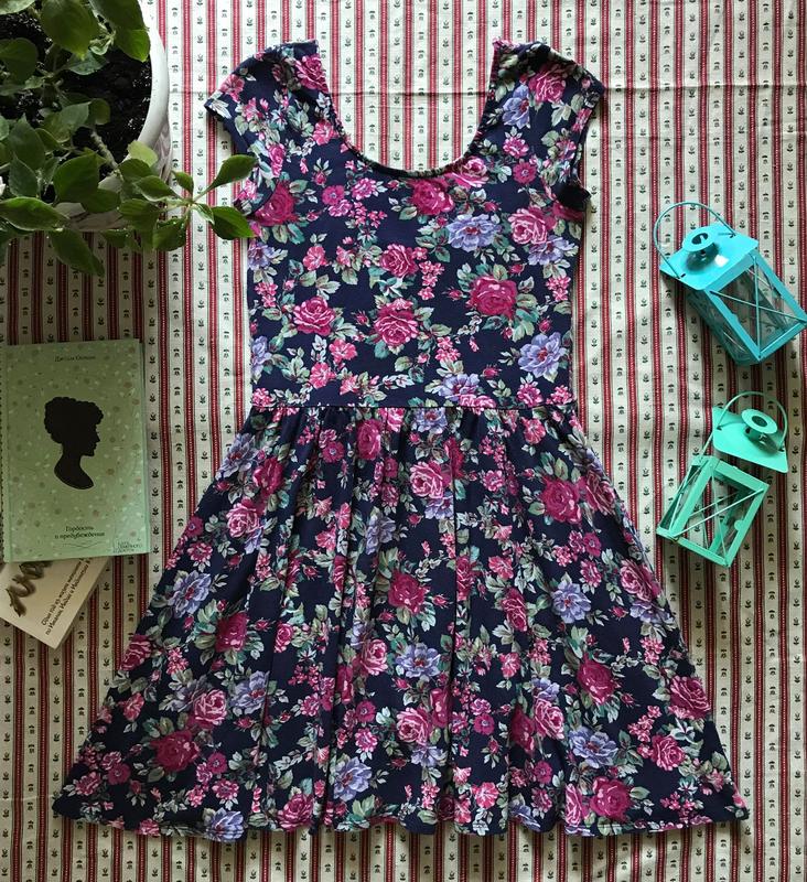 Сукня в квіти. На жаль бірка з розміром і складом не збереглася, тому орієнтуйтеся на заміри. Стан-повністю відповідає фото, без дефектів. Глибокий виріз на спині. Довжина 77 см, напівобхват пахвами 34 см, напівобхват по талії 32 см, довжина самої спідниці 40 див. Добре тягнеться.