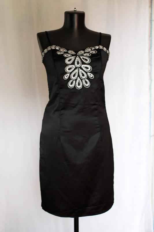 Чёрное платье из плотного атласа. Садится по фигуре.Украшено апликацией. Новое, бирки нет.