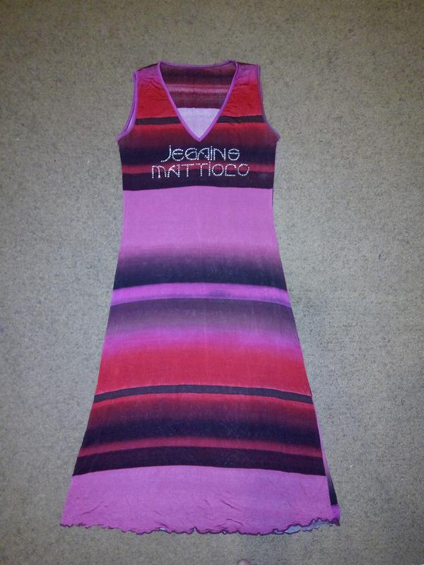 Очень красивое платье в красно-розовых тонах.Очень тонкий трикотаж.Немного светится.На груди надпись камушками.