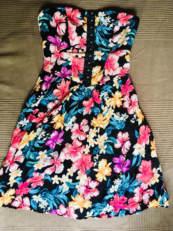 Яркое летнее платье-сарафан бюстье Colins XS Цвет: рисунок в яркие цветы, насыщенные цвета розовый, синий, желтый, черный Сукню на потайной молнии, подклад плотный, резиночка на спинке, бретели потерялись, отлично держится без них. Замеры: Длина 65 см ПОГ 35 см ПОТ 31 см ПОБОДЫ 60 см Производитель: Турция возврат и обмен нет, все вопросы к Покупателю! К