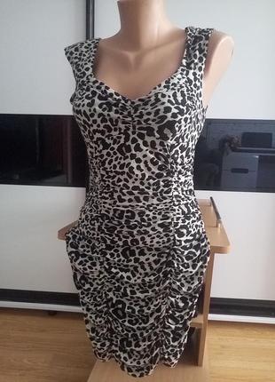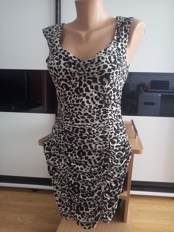 Платье в принт "Леопард" в хорошем состояние.Отличное европейское качество. Ткань приятная(вискоза +эластан) на ощупь, крой прямой (облегающее) по телу, вдоль всего платья идут сборки. Смотрится шикарно Размер М. Длина- 80 см ПОГ- 40 ПОТ- 30 см ПОБ- 35 см. Очееень хорого тянется! оплата на карту приват банка. отправляю укрпочтой,новой почтой.