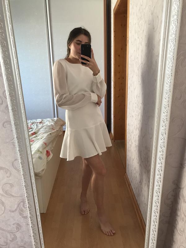 Дуже ніжне та елегантне плаття білого кольору Із шифоновими рукавами, та рюшею з низу Розмір пише 40 але одягнуто на Xs-s Думаю добре буде в на М