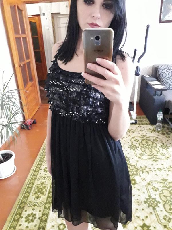 Платьн с шифоновой юбкой. Состояние идеальное, за исключением отсутствия на груди блесток. В глаза не бросается