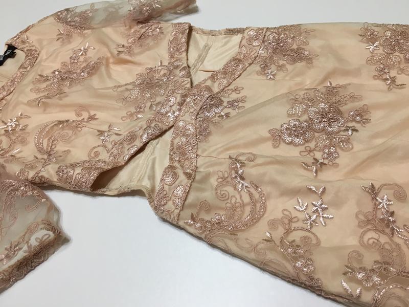 Нарядна сукня з вирізами по боках розово персикового кольору в дуже хорошому стані, зверху сіточка з ніжною вишивкою , підкладка поліестер, розмір 8( приблизно на xs) . Заміри на фото.