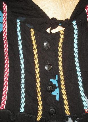 Стильное, фирменное платье-туничка,пр-во Индия,оригинального фасона. 100% вискоза.На чёрном фоне голубенько-серенькие листочки-цветочки, отделка разноцветной тесьмой, удобные два внутренних кармашка впереди и поясок. Указан размер М/28. Замеры:плечи-38 см, ПОТ (под грудью по пояску) - 41 см, полная длина -80 см.Обувь на фото продаётся. Смотрите мои объявления, много интересных, фирменных вещей.