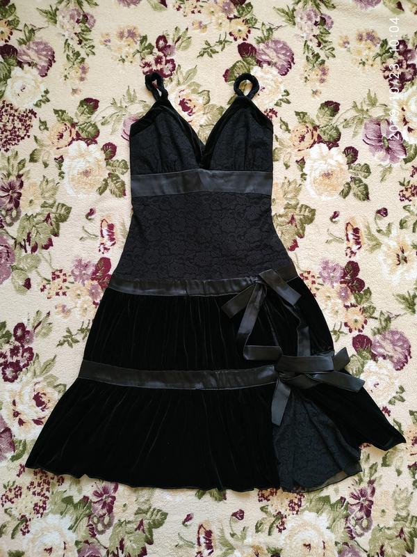 Чёрное нарядное платье, верх гипюр, низ микровильвет. На спинке атласная шнуровка, впереди по левой ножке гипюровая вставка. Состояние очень хорошее. Размер 40-42 наш или 34-36 евро.