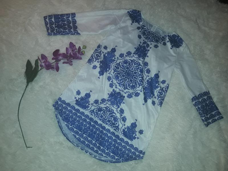 розмір вказано М, вреалі не блистить, як на фото, можна також носити як сукню. тканина стрейч, тянеться. довжина сукні ззаді 80 см. спереді 77 см. ог 92- 98 см. донизу вільно. в бедрах 100 чи тянеться до 110 см. рукав 45 см.
