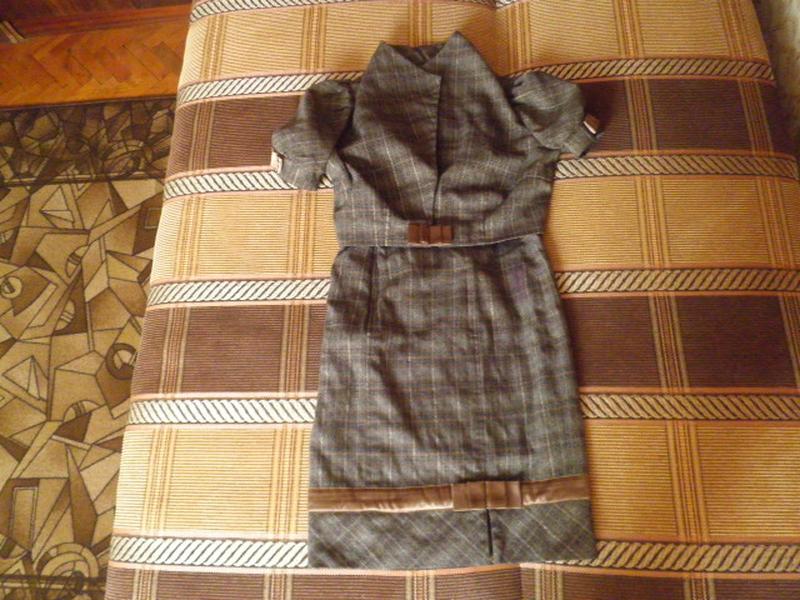 Платье и болеро с костюмной ткани ,в полоски, переходящие в клетку, есть полоски с ненавязчивой люрексовой нитью.Размер 42-44,Длина платья -70 см, ПОГ-38 см.,ПОТ-36см.,ПОБ-42см. Болеро с манжетами на рукавах, декорированы бантиками. Шито на заказ.Смотрится нарядно.