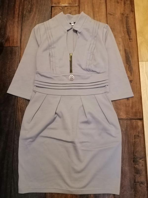 Рукав 3/4, по бокам карманы. Ткань плотный трикотаж. Размер указан 44,основная бирка срезана. Платье новое, замочек рабочий.