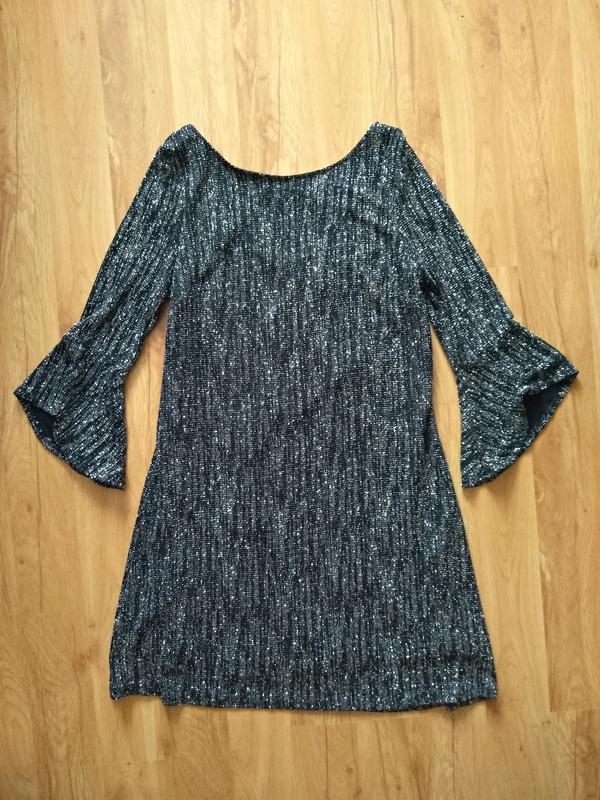 Платье с блёстками от F&F. Модель трапеция, вырез на спинке глубже, чем спереди, красивый рукав. Идеально подойдёт на новогоднюю вечеринку. Размер 12, 40, L, также будет отлично сидеть и на M. Замеры - плечи 34 см, рукав 46 см, пог 42 см, длина 84 см. Состояние идеальное, без дефектов.