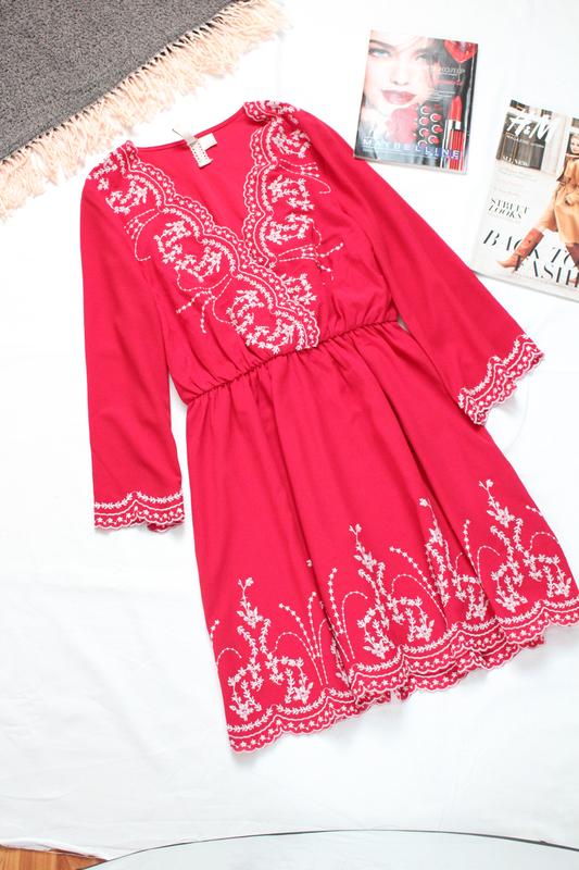 Малиновое красное платье короткое платье м 38 размер h&m платье с вышивкой
