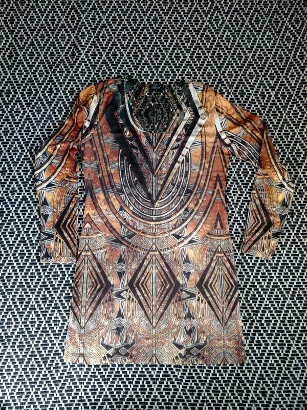 Нарядное платье, супер расцветки. На груди овальный вырез, по спинке кружево. Пошито из тонкого трикотажа. В груди 46 Длина 87 Рукав 62