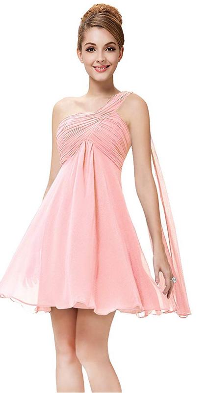 шикарне плаття з шифонової вечірки має нерегульований дизайн із заднім плечем та чудовий бюст з рюшем, який досягає найвищого дизайну. Для більшості жінок це плаття впаде прямо або вище коліна. Цей веселий дизайн ідеально підходить для подружок нареченої або коктельних вечірок