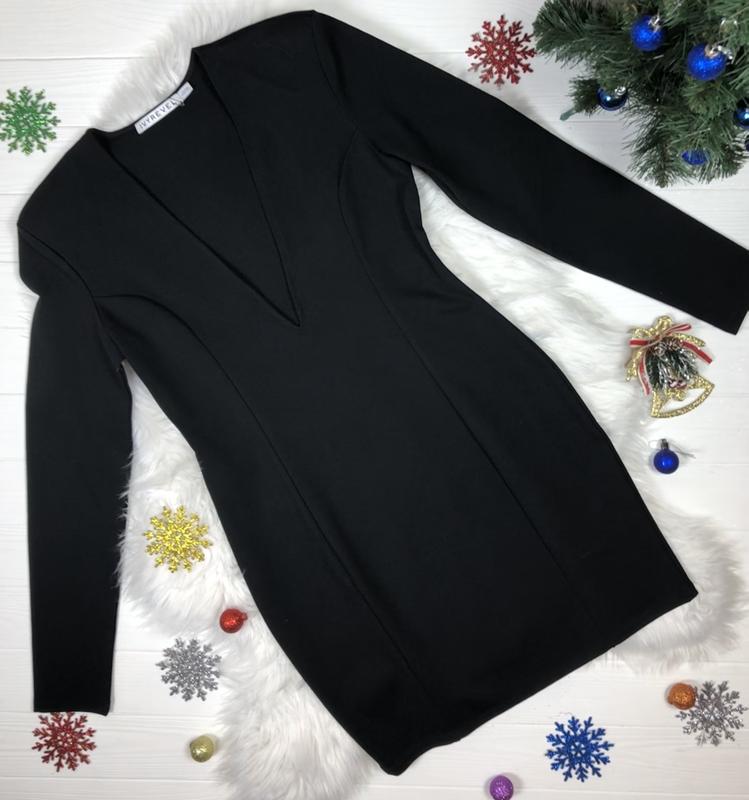 Класична чорна сукня по фігурці. Нова з біркою. Тканина плотна та гарно тягнеться. Глибокий виріз на декольте. Є пришиті плечики. На бірці М але підійде на L. ОГ 94-96 ОТ 76 ОБ 96-98 Довжина 85 Рукав 60