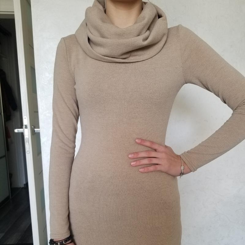 Туніка плаття в бежевому кольорі. Має обємний воротнік хомут. Через всю спину замок.