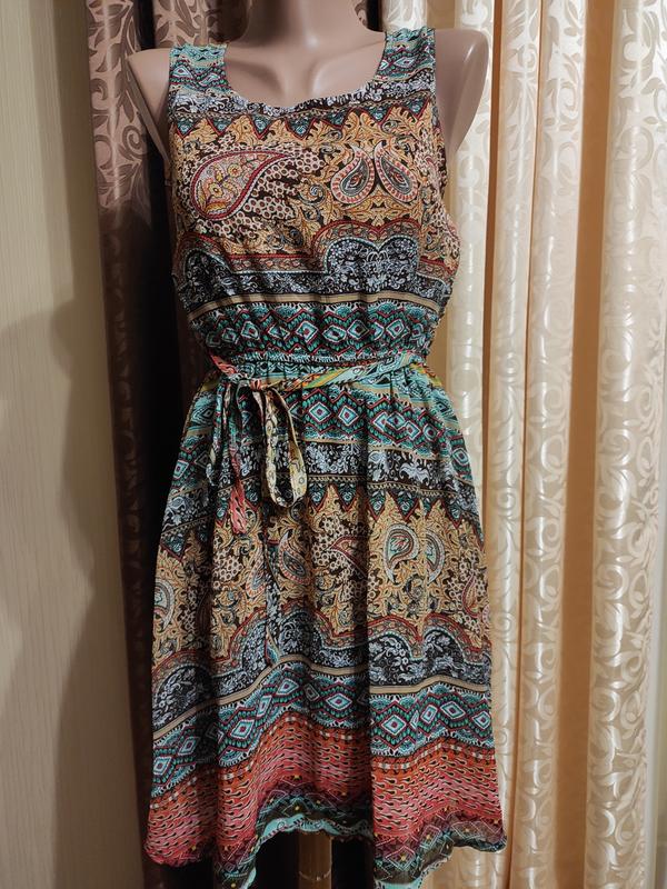 Летнее платье с весёлым принтом. Не светится, завязывается на пояс, талия резинка.