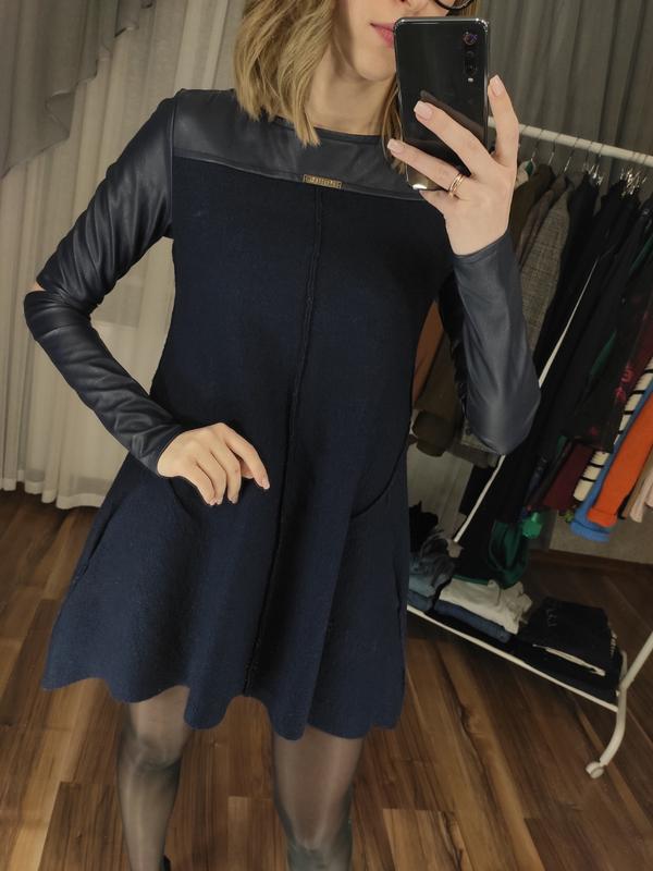 Неймовірно стильна тепла { в складі 20% шерсть} сукня темно-синього кольору з вставками із еко-шкіри. Одягала разів 3