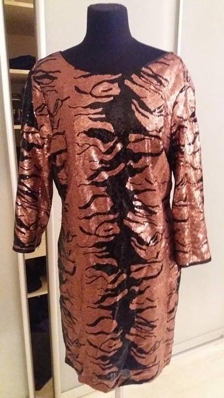 Очень красивое.нарядное платье от английского бренда Ве Ве Веаы.Расшитое мини пайетками черного и бронзового цвета. Очень стильно смотрится при этом. По спинке оригинальный полукруглый вырез. удобная молния. Рукав 3/4. Размер 12-14. Точные замеры ПОГ 50-51 см ПОТ 44-45 см ПОБ 51-51 см Длина 80 см Рукав-44 см (замеры сделаны из внутренней подкладке + хороший стрейч тянется) Стан на 5 из своего личного гардероба. мало.