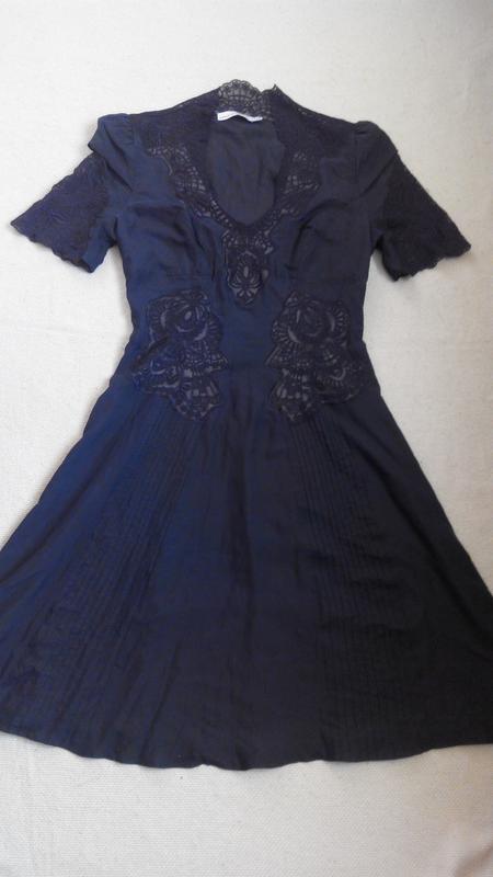 шелковое оригинальное платье, красиво украшенное верхняя часть кружевом; в плечах 36см, ПОГ 41см, ПИТ 37см, длина платья 88см