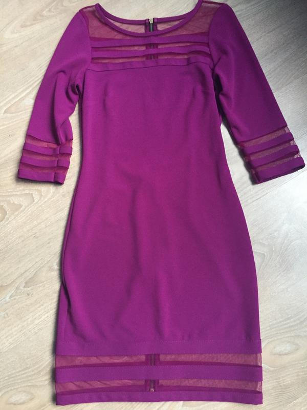 Красивое платье, цвет - цикламен, одевалось 2 раза. Сзади застежка -молния. Рукав 3/4. Отделка - очень качественная сетка. Производство Польша Длина - 91см, полуобхват груди - 38см, длина рукава от плеча - 43см, ширинп прозрачной вставки снизу - 10см Ткань стрейчевая, платье хорошо ложится по фигуре.