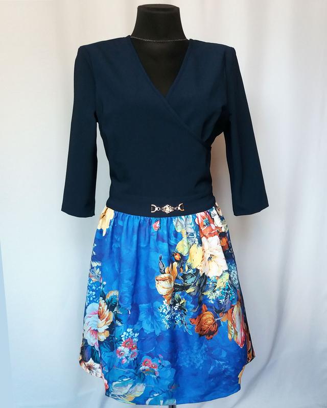 Стильное платье. Отличное качество пошива и материалов, турецкое производство. Крой с лифом на запах. Клешеная юбка цветочного принта. Пояс декорирован брошкой. Только реальные фото, личные! В наличии размер евро 42, на наш 46-48 Состав: 65 % полиэстер, 27 % вискоза, 8% лукра Отличное качество, производство Турция Много женской одежды и сумок, смотрите другие мои объявления http://shafa.ua/member/anna_rusynka/clothes