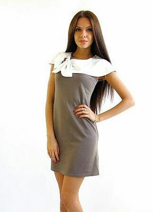 Трикотажне жіноче плаття, бант Розпродаж! Трикотажне жіноче плаття, Бант Сукня пошита з однотонної тканини лакоста. Широкий білий комір освіжає плаття і трохи виконує функцію рукави, злегка прикриваючи плече. На комірі праворуч закріплений широкий бант. Одна третя банта асиметрично лягає ближче до центру грудей, друга частина банта - 2/3 красиво викладається на плечі. Форма сукні - легка трапеція. Розміри в наявності: 44 Довжина сукні залежить від розміру: У розмірі 44р. – 85см. Кольори в наявності - какао - розмір 44