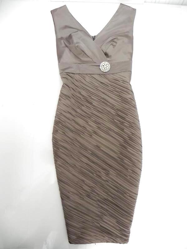 Ошатна стильна сукня, , ззаду потайна блискавка, брошка знімається. Ідеалізує фігуру за рахунок пошиття. Довжина нижче коліна. Правильна форма, красиво підкреслює груди, ефектно виглядає. Втягує все що треба втягнути і виглядати стрункою і витонченою. В реалі плаття набагато краще виглядає ніж на фото. В наявності залишився один розмір, заміри написані. Порівнюйте мої заміри зі своїм схожим сукнею або блузою - так буде легше визначитися з розміром. Розмір український 50 -52 ( на етикетці пише 46 європейський розмір - наш 50-52 ) Пахви 49-50см ( під грудьми) + складочки на грудях , то буде більше, краще. Напівобхват талії 45 см Стегна 53см Довжина сукні 110см