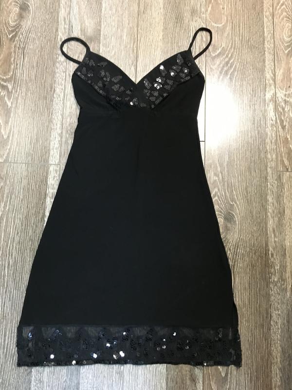 Красивое маленькое чёрное платье с декором из пайеткок. Внизу по бокам небольшие разрезы. Красиво подчеркивает фигуру. Размер s (+тянется). По запросу доп фото и замеры