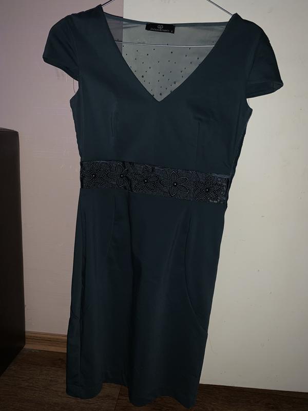 Сукня темно-зеленого кольору, дуже красиво виглядає - салится по фігурі . Пояс розшитий намистинами, на спині красива вставка з сітки прикрашена стразами. Одягала один раз!!! Виміри на запит