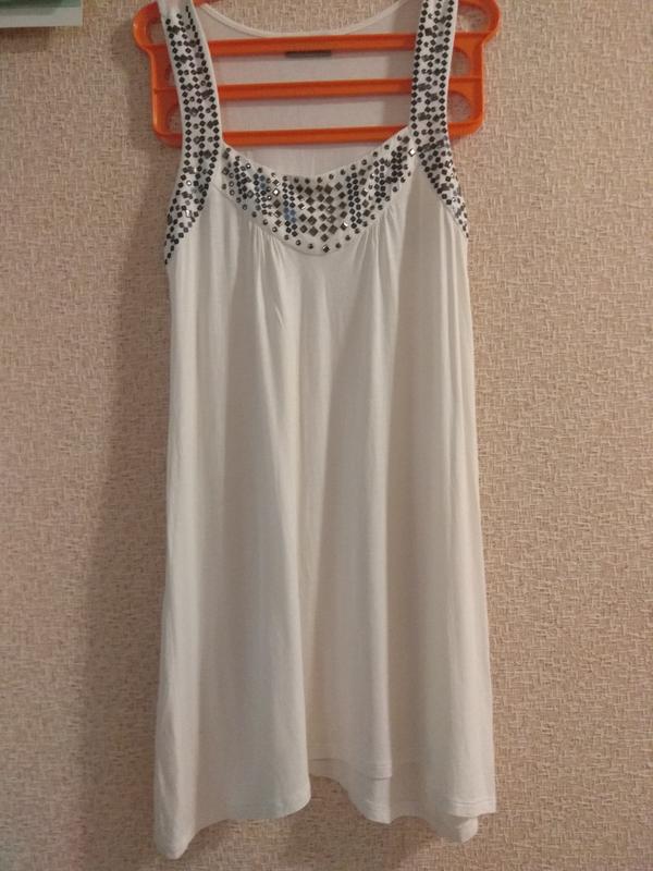 Отличное состояние, легкая дышащая ткань, вискоза трикотаж, украшенная металлическими клепками.Замеры: пог-45см,пот-поб-52см, длина-87см.,пройма рукава-28см.