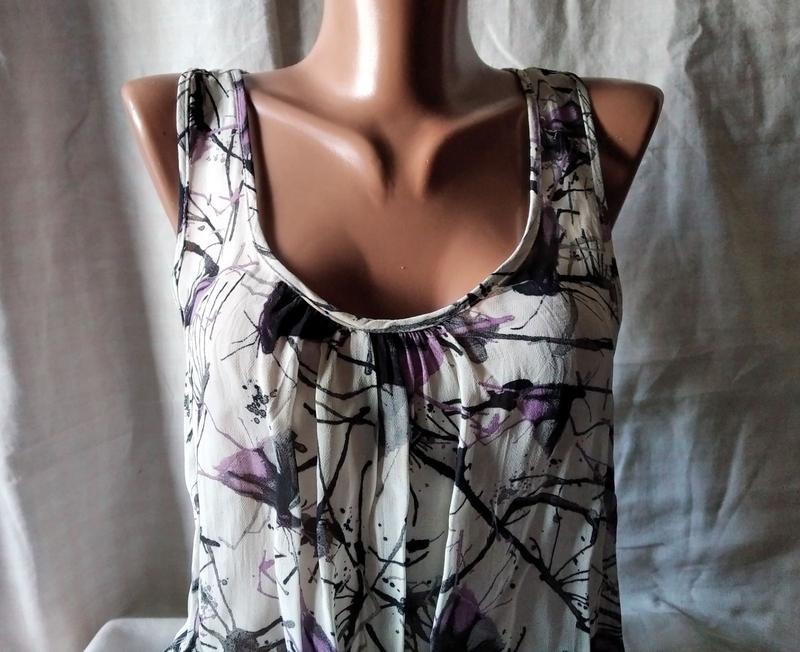 Натуральна,сучасна. З потрійною оборкою та живописним принтом"Метелики" Всі виміри зроблені в спокійному (не розтягнутому) стані. Довжина(по спині) 77 Завширшки(пахви) 46