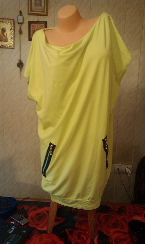 Стильная удлиненная туника-платье красивого лимонного цвета.Качественный Трикотаж хорошо тянется до 52-го размера.Манекен в 44м размере.
